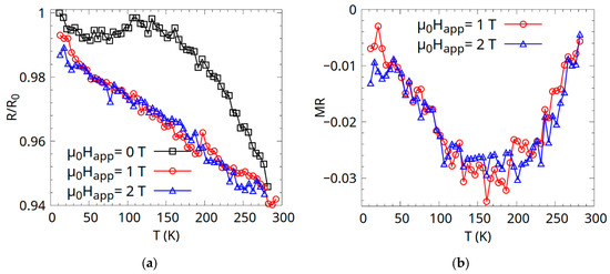 Resistance and magnetoresistance measurements were also carried out as a function of temperature, and the results are given in Figure 8. The values of the resistance are normalized to the value R0, which is the value of the resistance in the µ0Happ = 0 applied field, at low temperature.