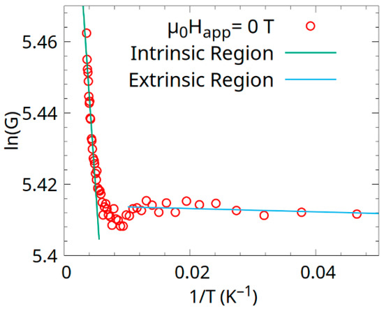 The Arrhenius plot was constructed relative to the conductance of the sample G, Figure 9, and the corresponding energy gaps were found. The linear fits revealed a possible activation energy of 0.006(4) meV for the extrinsic region and an activation energy of 3.2(2) meV for the intrinsic region. In the extrinsic region (low T), the small gap enables easy thermal excitation, contributing to the observed resistance decrease from 5 to 50 K in the zero field. The polycrystalline nature may introduce defect states, narrowing the effective gap. In the intrinsic region (high T), an activation energy of 3.2 ± 0.2 meV indicates intrinsic two-carrier conductivity, involving both electrons and holes, typical of a narrow-gap or gapless semiconductor at higher temperatures [32] (e.g., >150 K, where R/R0 decreases slightly). Over 150–300 K (kBT ≈ 12.9–25.9 meV), thermal energy easily excites carriers across the 3.2 meV gap, increasing conductance and reducing resistance, consistent with the negative temperature coefficient in Figure 8.