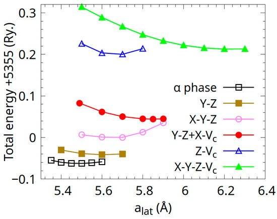 Band structure calculations for the Co0.5Mn1.5Al Heusler alloy considering the C1b structure (space group nr. 216) and the disorder types described in Table 1 were performed for S = 1. The total energies plotted as a function of lattice constant a are shown in Figure 10. As can be seen in Figure 10, the α-phase is the most stable. The Y-Z disorder type system is higher in energy with ΔE = 23.6 meV/atom, close to the thermic energy of 26 meV/atom. The W-type X-Y-Z disordered system exhibits higher energy with ΔE = 72.5 meV/atom compared to the α-phase. According to the total energy calculations, the occupation of the 4d site with mixed atom types is less favourable. Between these types of systems, by considering the mixing of atoms between Y-Z and X-Vc, the total energy increases by 120.8 meV/atom compared with that of the α-phase. All other considered cases, including mixing and the 4d site occupation, are less favourable, as shown in Table 2.