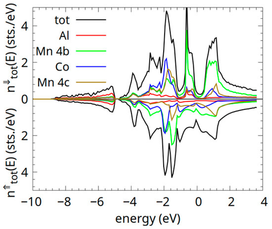 The spin-resolved density of states (DOS) calculations for the α-phase of the Co0.5Mn1.5Al alloy. The Al (red), Mn 4b (light green), Co (blue), and Mn 4c (dark green) type-resolved DOS are shown.
