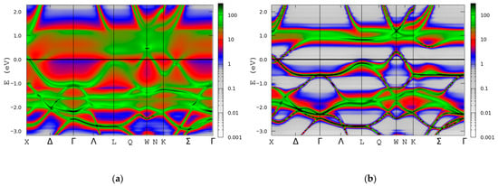 In order to investigate the half-metallic character, Bloch spectral functions are plotted for both the spin-up and spin-down channels in Co0.5Mn1.5Al alloys (Figure 12). Band crossing (near the X and W points in the Brillouin zone) in the spin-down channel at the Fermi level is present for both alloys, suggesting a spin semimetallic (SSM) electronic behaviour.