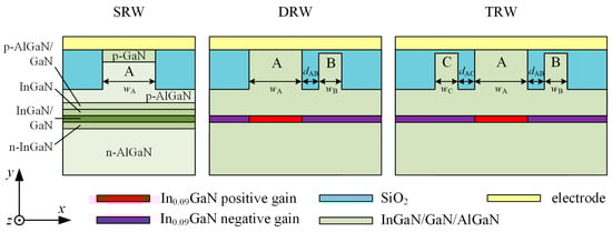 In this paper, SUSY is applied to two configurations of nitride-based EELs (Figure 1) to enhance their fundamental-mode emission. In the first configuration, two optically coupled ridges are employed: a wider ridge, denoted as A, and a narrower adjacent ridge, denoted as B. This configuration is referred to as a double-ridge waveguide (DRW). In the second configuration, three optically coupled ridges are used, with the widest labelled A and the narrower ones labelled B and C. This arrangement is referred to as a triple-ridge waveguide (TRW). A conventional structure featuring a single ridge is referred to as a single-ridge waveguide (SRW). Throughout this article, the laser regions located directly beneath the ridges are referred to as apertures.