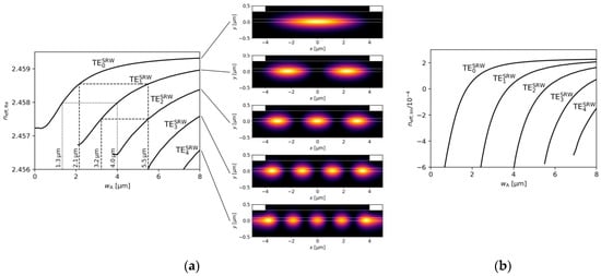The real part of the effective refractive indices corresponding to the optical modes found for the SRW structure, obtained for and (a) , (b) .