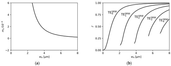 Figure 6a,b show the effects of varying on the real and imaginary parts of the effective refractive index. Figure 6c presents the confinement factors , which clearly indicate mode location. When approaches 0, the results for the DRW structure presented in Figure 6 become similar to those for the SRW structure with from Figure 2 and Figure 3. This is the expected result, since ridge B in the DRW structure does not significantly increase the width of the ridge region. For , the DRW structure simplifies to the SRW structure and there are only two modes confined to the aperture of (Figure 7a). The mode separation between these modes is relatively small (see Figure 2b), which may result in the excitation of higher-order modes.