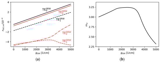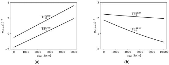 The relative mode separation calculated for TRW structures with , , , , and , obtained for (a) and various gain, (b) and various absorption values. The mode separation calculated for the SRW structure with was used to find the relative mode separation, (), in the range from to for (a), and from to for (b).