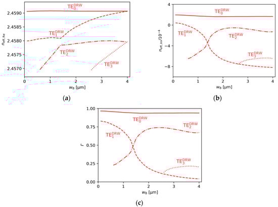 The (a) real and (b) imaginary parts of the effective refractive indices, and (c) ridge A confinement factor of the lateral modes present in the DRW structure, obtained for , , , and .