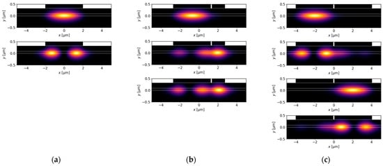 To overcome the problem of the possible excitation of higher-order modes in DRW structures, where small mode separations can be observed for narrow and wide ridge B, let us consider a ridge B with µm. According to Figure 6b, this is close to the optimal width to benefit from the SUSY effect. In the considered DRW structure, the real parts of the effective refractive indices become closer (Figure 6a) as approaches , but they do not intersect due to the presence of strong coupling between the modes, which leads to anti-crossing behaviour. In contrast, both the imaginary parts of the effective indices (Figure 6b) and the confinement factors (Figure 6c) can intersect. The crossings for these quantities occur because at the anti-crossing point the coupled modes acquire similar field distributions, as presented in Figure 7b, and are no longer confined to one ridge. For a ridge B with width of 1.4 µm, the effective refractive indices of modes and are nearly equal and the optical losses associated with the negative imaginary part of the effective refractive index () are maximized for both modes, while of fundamental mode remains positive (Figure 6b), indicating the possibility of lasing. Moreover, the mode located in ridge A does not change significantly when the is modified over a broad range from 0.1 µm to 4.0 µm. The maximum relative changes in for this mode, using the value calculated for µm as a reference, is only 3%. This effect enables stable single-lateral-mode operation and high emitted optical power due to the broad main ridge, which is a key feature of the SUSY effect.