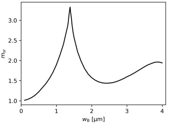 Relative mode separation calculated for DRW structures with different ridge B widths, obtained for , , , and . The mode separation calculated for the SRW structure used to find is (see Figure 2b).