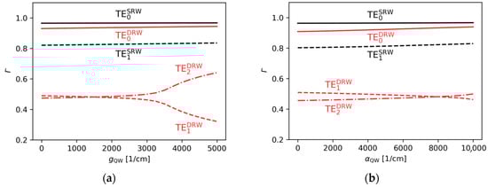 Ridge A confinement factor found for the SRW structure (, black lines) and DRW structure (, , , red lines), obtained for (a) and various gain, (b) and various absorption.