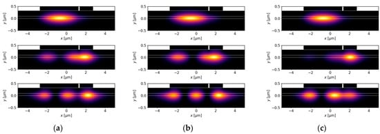 Light intensity distributions for DRW structures obtained for , , , , and various ridge B widths: (a) µm, (b) µm, and (c) µm.