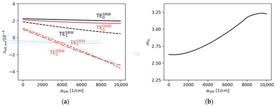 Figure 4a,b show the effect of varying the gain under the ridge and the absorption outside the ridge within the active region on the real part of the effective refractive index. The changes observed are very minor. This is because a variation in the gain/absorption in the range from −104 cm−1 to 5 × 103 cm−1 corresponds to a change in the imaginary part of the refractive index (Figure 5a,b). Therefore, from the perspective of the SUSY-based design procedure described above, changes in the imaginary part of the refractive index are assumed not to affect the selection of the optimal ridge widths.