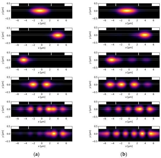 In Figure 10a, for gain ranging from 0 to , more than 90% of the mode is confined in the area below the ridge A, while the and modes are confined in less than 50%. This results in significantly lower imaginary parts of the effective refractive indices for both modes (Figure 11a). For gain of more than , PT symmetry breaking modifies distributions of both higher-order modes and mode discrimination is reduced. Nevertheless, in the case shown here the difference in imaginary parts of the effective refractive indices above for the DRW structure is larger than in the case of the SRW structure of the same width of ridge A (Figure 11a). The calculations also show that relative mode separation (Figure 11b) above decreases with the reduction in optical coupling between the ridges. For and , the relative mode separation is only 70% of the highest relative mode separation reported here for the DRW structure with , , and . This drop in the mode separation value coincides with the tendency of the mode to localize in regions corresponding to the position of ridge A or its SUSY partner ridge B (see Figure 12), which leads to a decrease in the SUSY effect.