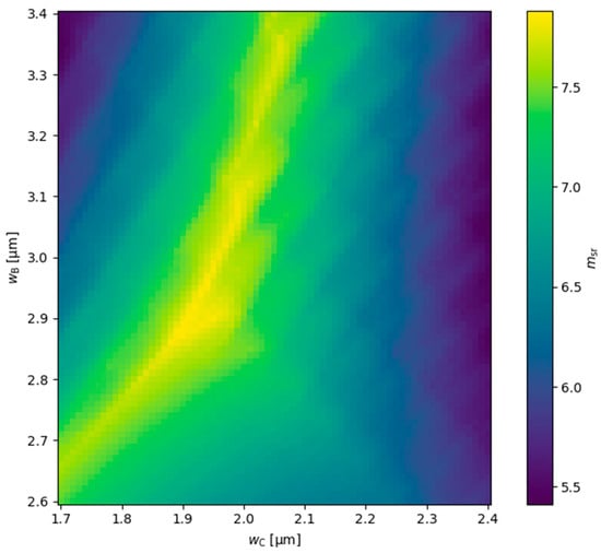 For the DRW structure, the ridge widths were further optimized to achieve higher relative mode separations. In this two-parameter analysis, ridge A widths were varied between 3.6 µm and 4.5 µm, and ridge B widths were varied between 1.0 µm and 1.7 µm. The resulting relative mode separations are shown in Figure 9. Generally, as increases the corresponding value that maximizes also increases, which is consistent with Figure 2a. For the range up to 4.12 µm, a similar trend is observed for relative mode separation. The highest value, 3.59, occurs at and . For higher values, a significant decrease in is observed, which is related to the increasing of mode , which originates from (see Figure 3).