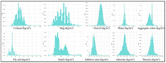 Relevant features and target variables were identified and compiled through a manual extraction process to ensure accuracy and relevance. The final dataset comprises 22 features. Among them, acceleration curing serves as a manually assigned label, and strength is defined as the target variable. The remaining variables are treated as input features and are structured in a standardized format for analysis. The abbreviations, units, value ranges, and standard deviations of all variables are summarized in Table 1. Additionally, the 25th percentile (Q1), median (Q2), and 75th percentile (Q3) of each variable are reported. Figure 1 illustrates the detailed distributions of key variables, including cement content, slag content, fly ash content, coarse sand content, fine sand content, and stone aggregate content. The distributions of all parameters are presented in the Appendix B (Figure A1 and Figure A2).
