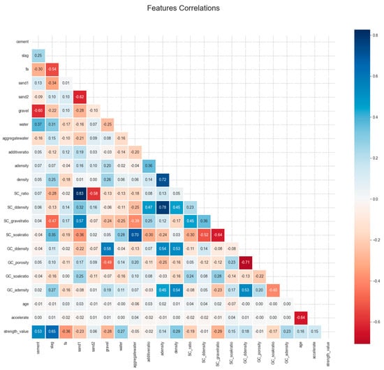 As shown in Figure 2, the Pearson correlation coefficient was used to assess the relationships among the input features and between each feature and the target variable in the concrete dataset. The resulting heatmap uses a color gradient to indicate that the absolute correlation coefficient approaches one, reflecting increasingly strong positive or negative correlations between variables. Through correlation analysis, eight features were identified with absolute Pearson correlation coefficients ranging from 0.53 to 0.65, indicating moderate-to-strong correlations with the target variable. The distributions of these strongly correlated features are presented in the Appendix B (Figure A3, major correlations). Specifically, the correlation coefficient between the cement content and strength was 0.5325, and that between the slag content and strength was 0.6460, both of which suggest a significant positive correlation with the concrete strength. Additionally, a strong negative correlation was observed between GC_ddensity and GC_porosity, with a coefficient of −0.7076, indicating that aggregate bulk density and porosity are inversely related. The coefficient of 0.5272 between GC_ddensity and GC_adensity further implies a significant positive relationship between aggregate bulk density and apparent density.