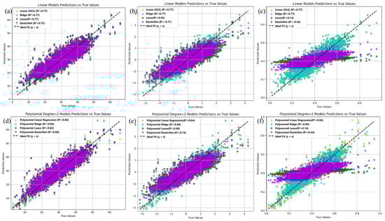 Figure 3b,e shows the prediction results of linear regression and polynomial regression, along with the regularization methods, on the standardized dataset X1. The predictive performance of the base models remains largely unchanged. However, the performance of the regularized models slightly decreases, particularly in the case of Lasso regression, where the R2 values decrease to 0.65 and 0.71, respectively. This effect becomes more pronounced on the normalized dataset X2, as illustrated in Figure 3c,f. This may be attributed to the fact that linear and polynomial regression are generally insensitive to feature scaling [], as their objective is solely to minimize the sum of squared errors without any regularization term. Consequently, whether features are standardized or normalized does not affect the relative proportions of the estimated parameters. In contrast, Lasso and Elastic Net are sensitive to feature scaling, and their performance depends more heavily on careful tuning of the regularization parameter to achieve optimal results.