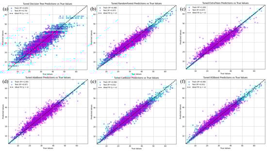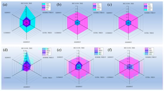The prediction results of (a) decision trees, (b) random forests, (c) extratree regressors, (d) AdaBoostRegressor, (e) CatBoostRegressor, and (f) XGBRegressor.