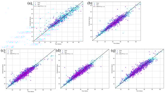 The prediction results of TabPFN on five subsets. (a) 24 h steam curing, (b) 48 h steam curing, (c) 7 d standard curing, (d) 14 d standard curing, (e) 28-day standard curing.