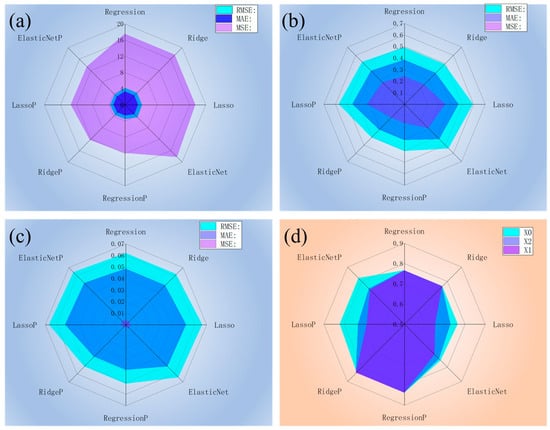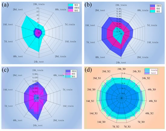 Figure 3a shows that the R2 results of the test set (0.75–0.77) indicate that OLS effectively identifies the relationship between the features and concrete strength. Moreover, applying ridge, Lasso, and elastic net regression methods to the linear model on dataset X0 did not result in significant differences in the fitting results. The corresponding polynomial fitting predictions are shown in Figure 3d, where R2 ranges from 0.82 to 0.84, suggesting that polynomial fitting outperforms linear fitting. Although the three regularization methods yielded similar results, they may lead to better generalization, potentially offering improved performance on more complex datasets.