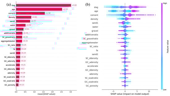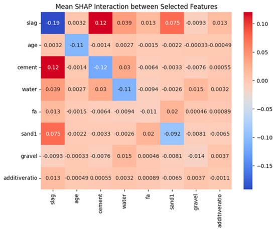 Model interpretation techniques, such as Shapley Additive exPlanations (SHAP), were employed to analyze the influence of key features on concrete compressive strength. These methods facilitate a detailed assessment of both individual and combined effects of critical variables []. Specifically, the interdependencies between compositional factors and material characteristics were examined to elucidate their joint impact on concrete strength. This SHAP-based analysis provides new insights into the complex relationships among features and offers valuable guidance for the design and optimization of concrete mixtures in practical engineering applications.