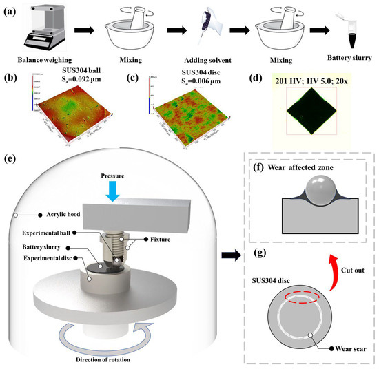 (a) Schematic diagram of the preparation process for lithium battery slurries LFP/NCM; surface Sa of SUS304 (b) balls and (c) discs before the experiment; (d) surface hardness of the disc; (e) schematic diagram of the point contact of the friction and wear tester device; (f) cross-sectional view of the ball–disc contact area; (g) schematic diagram of the disc wear area.