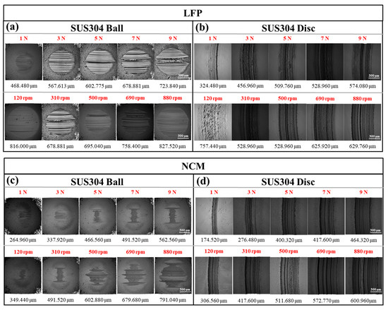 (a,b) LFP and (c,d) NCM slurry system after friction experiment, SUS304 (a,c) ball and (b,d) disc under different load (1–9 N) and speed (120–880 rpm) light microscope.