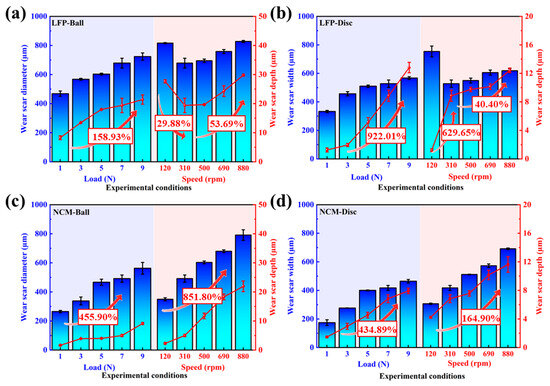 After the friction experiment of (a,b) LFP and (c,d) NCM slurry system, the WSD and wear depth comparison of (a,c) SUS304 ball, the WSW and wear depth comparison of (b,d) disc.