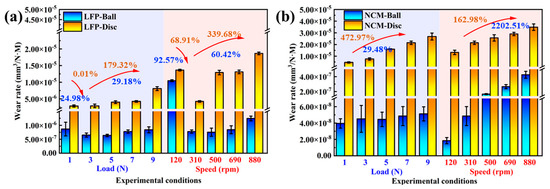 The calculated results of δ are shown in Figure 6. From Figure 6a and Figure S3, it can be seen that in the LFP system, δ shows a trend of first decreasing and then increasing with the increase in load and rotational speed. Under low load (1 N) conditions, the ball and disc undergo repeated running-in, with the δ of the ball and disc being 8.662 × 10−7 mm3·N−1·m−1and 2.853 × 10−6 mm3·N−1·m−1, respectively. When the load increases to 3 N, although the wear volume of the ball and disc increases compared to that at 1 N, the stress distribution tends to be uniform due to increased contact pressure, resulting in more stable and uniform wear. The δ of the ball and disc decreases by 24.98% and 92.57%, respectively, reaching the minimum values. When the load increases to 9 N, the load-bearing capacity of the slurry approaches its limit, leading to intensified wear of the ball and disc, and the δ of the disc increases nearly 3-fold compared to that at 1 N. In the LFP system at low rotational speed (120 rpm), severe wear occurs on the ball and disc, with their δ being 1.045 × 10−5 mm3·N−1·m−1 and 1.364 × 10−5 mm3·N−1·m−1, respectively. Similarly, when the rotational speed increases to 310 rpm, the wear scars of the ball and disc are the smallest, with δ being 7.759 × 10−7 mm3·N−1·m−1 and 4.241 × 10−6 mm3·N−1·m−1, respectively. As the rotation speed further increased to 880 rpm, the δ of the ball decreased by 92.57% compared with 120 rpm. However, due to the reduced load-bearing capacity of the slurry, the wear of the disc intensifies, with its δ increasing by 36.73%.