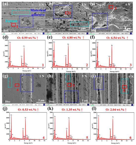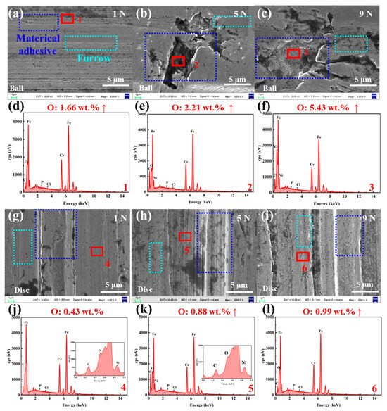 Figure 9 and Figure 10 show the microstructure of the wear regions and the O element composition analysis of the SUS304 balls and discs during the homogenization process of the NCM slurry. All elements detected in the wear regions are supplemented in Figure S7 and Table S2. As observed in Figure 9a–c, the worn areas on the balls consist of material peeling pits and a small amount of furrows. With increasing load, material peeling becomes more severe, and the O element content gradually increases from 0.4 wt. % to 6.54 wt. % (Figure 9d–f). Figure 9g,h shows that there is only slight material removal on the surface of the disc under low load, and the wear is relatively small. As the load gradually increases to 9 N, the disc surface exhibits significant characteristics of “three-body abrasive wear”, with an increased number of furrows and further intensified plastic deformation. The content of O element in the wear area is shown in Figure 9j–l. As the load increases from 0.4 wt. % to about 2 wt. %, a certain degree of oxidative corrosion occurs.