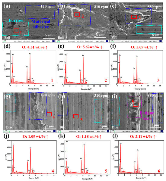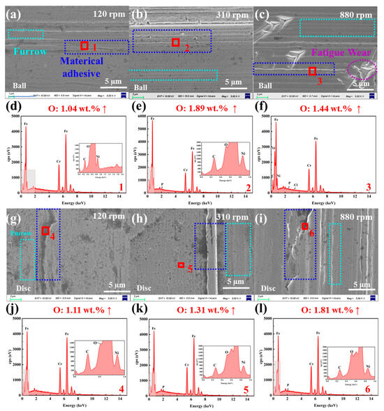 Figure 10a–c reveal that in the NCM system at low rotational speed, a small amount of furrows and pits left by material peeling appear on the ball surface, with the O element content in the pits reaching 4.51 wt.% (Figure 10d). With the increase in rotational speed, the peeling pit gradually evolved into a large-scale, deeper “pocket” shaped pit, the material removal was intensified and accompanied by a large number of deeper furrows, and the content of O element gradually increased to 5.09 wt. % (Figure 10e,f). The micro-morphology of the wear area of the disc changes with the rotation speed as shown in Figure 10g–i: The micromorphology of the disc’s worn area changes with rotational speed as shown in Figure 10g–i: material wear and spalling (120 rpm) → emergence of numerous deep furrows (310 rpm) → occurrence of fatigue cracks (880 rpm). The O content in the wear area increases from 0.4 wt.% to about 3 wt.% (Figure 10j–l). Similarly, in the NCM slurry system, the wear behavior exhibits characteristics of adhesive wear under low-speed and low-load conditions, followed by a gradual transition process that progresses sequentially to abrasive wear and then to fatigue wear. It was found that the content of O element on the surface of the ball was higher than that on the surface of the disc under the two slurry systems, which is because the continuous wear of the balls causes the SUS304 substrate to continuously react with active substances in the slurry, generating a large amount of oxides. Under the conditions of high speed (880 rpm) and high load (9 N), the oxidative corrosion wear on the ball and disk surfaces is more severe.