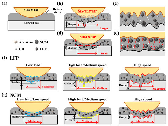 Wear mechanism of SUS304-LFP / NCM. (a) Schematic diagram of contact form before friction experiment, (b,d) macro wear diagram and (c,e) micro mechanism diagram of ball and disc wear area under (b,c) LFP and (d,e) NCM slurry system, the wear mechanism of (f) LFP and (g) NCM slurry system under different working conditions.