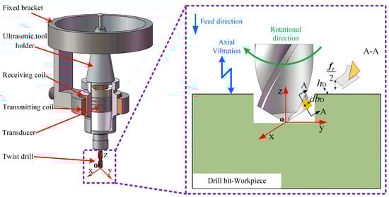 Regarding the mechanism of ultrasonic vibration-assisted drilling, Pu et al. [10] studied titanium alloy ultrasonic vibration-assisted drilling, observed chip morphology through high-speed cameras, analyzed tool temperature changes through infrared temperature measurement, and revealed the influence of ultrasonic vibration-assisted drilling on the reduction in cutting force and temperature increase. Huang et al. [11] investigated the wear characteristics of twist drills in ultrasonic vibration-assisted drilling of carbon fiber reinforced plastics (CFRP). They demonstrated that ultrasonic assistance effectively reduces tool wear and extends tool life compared with conventional drilling. Chen et al. [12], through theoretical modeling and experimental research, established a theoretical domain of geometric chip breaking conditions, and the advantages of ultrasonic vibration-assisted drilling technology in terms of chip breaking effects, surface roughness, and tool wear have been verified through experiments. Lu et al. [13] established a model for predicting cutting forces for longitudinal torsion ultrasonic drilling (LTUM) and established the tool trajectory equation. Through kinematic analysis, they studied the dynamic cutting characteristics, and compared experiments showed that the cutting force of longitudinal torsion compound ultrasonic vibration-assisted drilling was markedly higher than in conventional drilling operations. Wei et al. [14] combined Deform-3D simulations with experimental validation to investigate the micro-drilling performance of titanium alloys and aluminum alloys. They demonstrated that ultrasonic assistance can markedly suppress interlayer damage, while simultaneously lowering thrust force and drilling temperature.