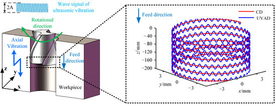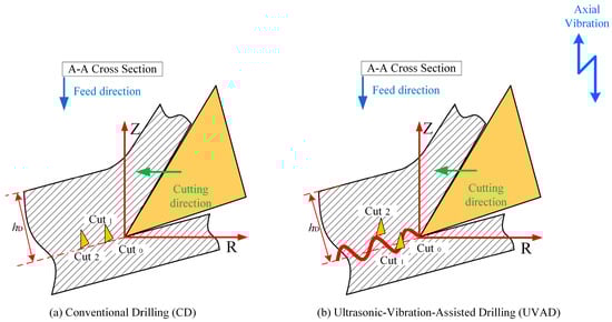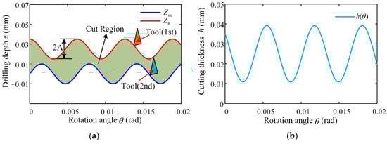 As illustrated in Figure 3, the trajectory of ultrasonic vibration-assisted drilling generally follows a downward path along the tool axis, yet it deviates from a smooth curve and instead exhibits a sinusoidal form with periodic oscillations. Relative to the conventional drilling path in Figure 3, this trajectory displays a displacement offset between two successive cutting paths. Moreover, in contrast to traditional drilling, the axial spacing of the primary cutting edges in ultrasonic vibration-assisted drilling varies dynamically, leading to periodic fluctuations in instantaneous chip thickness with the angular rotation of the drill bit.