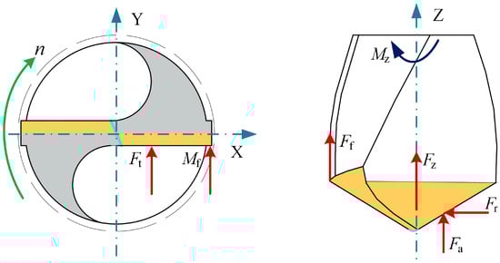 where hD is the thickness of the cutting layer; dbD is the cutting width; KT, KR and KA are the tangential, radial and axial cutting force coefficients, respectively. dFT, dFR, and dFA are the tangential, radial, and thrust forces of the cutting edge microelements, respectively.