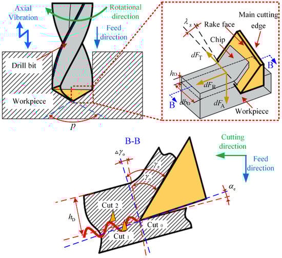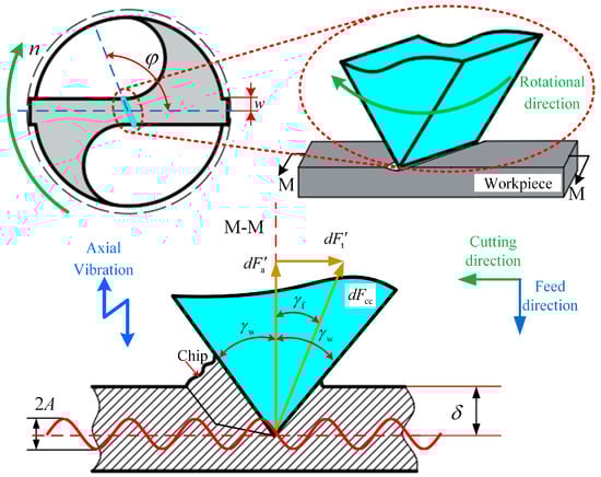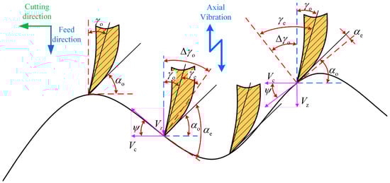 In ultrasonic vibration-assisted drilling, both the cutting speed and the angle of the tool’s main cutting edge vary continuously. A schematic illustrating the dynamic cutting angle of the micro-element during the cutting process is presented in Figure 7. The actual cutting geometry in operation can be represented as