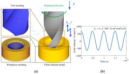 Meshing model of tools and workpieces: (a) FEM simulation model; (b) instantaneous axial velocity.