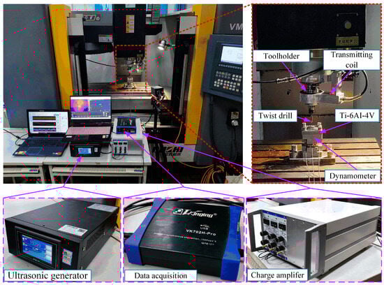 Titanium alloys are known as “all-round metals” and “space metals” owing to their exceptional combination of low density, superior strength, excellent corrosion resistance, high-temperature tolerance, and excellent low-temperature performance, and are extensively employed in high-tech industries including medical devices, aerospace, and marine engineering [1,2]. Nevertheless, their poor thermal conductivity, high plasticity, and low elastic modulus characteristics of the material during machining make it a typical hard-to-cut material, and during semi-closed cutting operations such as drilling and tapping, there will be difficulties in chip breakage, serious tool adhesion wear, and intermittent edge accumulation, which directly affects the machining accuracy and drilling efficiency [3,4]. In drilling and machining, it often faces problems such as chip winding around tools, poor surface quality, and rapid tool wear. To solve these challenges, ultrasonic vibration-assisted drilling (UVAD) technology has emerged, which usually refers to the use of ultrasonic waves with vibration frequencies higher than 15 kHz to assist drilling [5,6]. Compared to conventional drilling (CD), ultrasonic vibration-assisted drilling has the advantages of reducing cutting force and friction, improving hole surface quality, promoting chip breaking and evacuation, and improving machining efficiency [7,8,9], providing an effective method for improving both quality and efficiency in the field of machining, especially when machining difficult-to-machine materials.