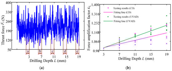 Thrust force curves and fitting function images of different drilling depths: (a) thrust force curves of ultrasonic vibration-assisted drilling; (b) the variation law of force amplification factor.