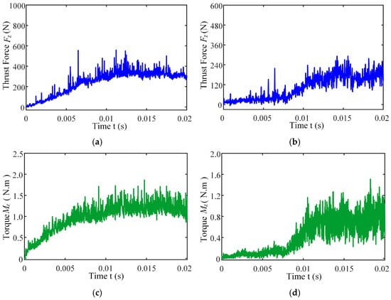 Instantaneous thrust force and torque change curves under different drilling methods: (a) thrust force of CD; (b) thrust force of UVAD; (c) torque of CD; (d) torque of UVAD.