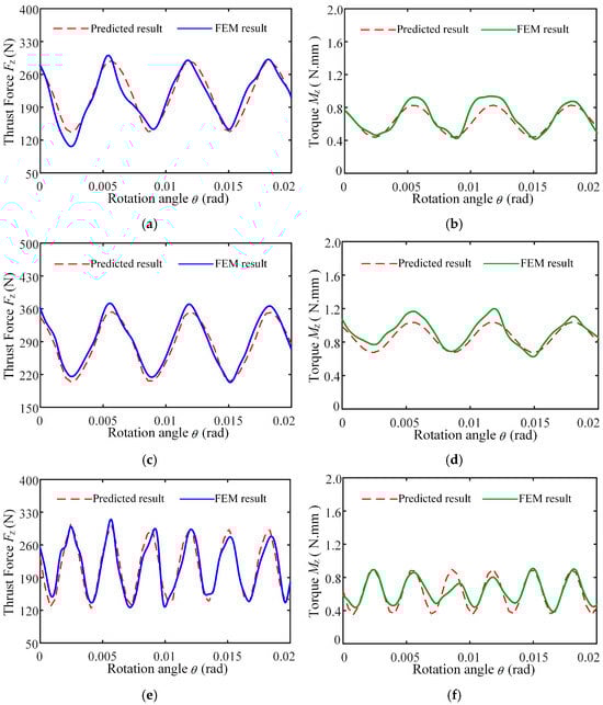 Instantaneous thrust force and torque change curves of analytical model prediction and finite element simulation: (a) Instantaneous drilling thrust force of n = 1200 r/min, fr = 0.05 mm/r, A = 6 μm, f = 20,010 Hz; (b) Instantaneous drilling torque of n = 1200 r/min, fr = 0.05 mm/r, A = 6 μm, f = 20,010 Hz; (c) Instantaneous drilling thrust force of n = 1200 r/min, fr = 0.07 mm/r, A = 6 μm, f = 20,010 Hz; (d) Instantaneous drilling torque of n = 1200 r/min, fr = 0.07 mm/r, A = 6 μm, f = 20,010 Hz; (e) Instantaneous drilling thrust force of n = 600 r/min, fr = 0.05 mm/r, A = 6 μm, f = 20,010 Hz; (f) Instantaneous drilling torque of n = 600 r/min, fr = 0.05 mm/r, A = 6 μm, f = 20,010 Hz.