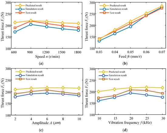Effects of ultrasonic vibration-assisted drilling variables on force generation: (a) thrust force variation law under different spindle speeds; (b) thrust force variation law under different feeds; (c) Thrust force variation law under different amplitudes; (d) thrust force variation law under different frequencies.