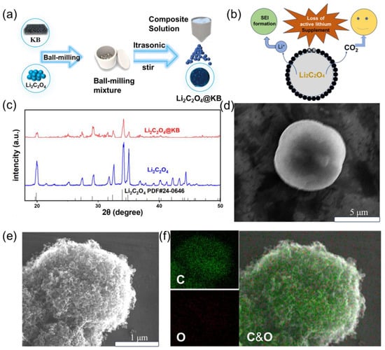 (a) Schematic illustration of the synthesis process of Li2C2O4@KB composite. (b) Mechanistic diagram of the lithium replenishing process of Li2C2O4@KB. (c) XRD profiles of Li2C2O4@KB and Li2C2O4. (d) SEM images of Li2C2O4 (e) SEM images of Li2C2O4@KB. (f) EDS-mapping of Li2C2O4@KB.