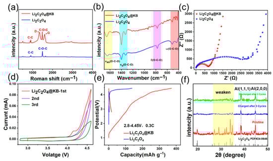 (a) The Raman spectrum curves for Li2C2O4 and Li2C2O4@KB. (b) FT-IR spectra of Li2C2O4 and Li2C2O4@KB. (c) EIS plots of Li2C2O4 and Li2C2O4@KB. (d) The CV profile of the Li2C2O4@KB half-cells for the first three cycles (scan rate: 0.1 mV s−1). (e) Initial charge–discharge curves for Li2C2O4 and Li2C2O4@KB half-cells at 2.8 to 4.45 V at 0.3 C. (f) XRD profiles of Li2C2O4@KB nanocomposite electrode before cycling, after three cycles in the charged state, and after three cycles in the discharged state.
