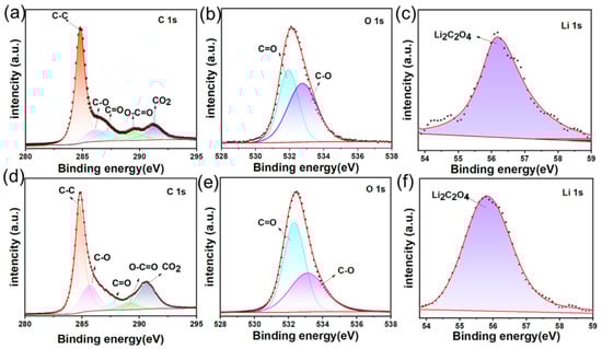 The morphology and microstructure of the Li2C2O4@KB composite and the resulting electrodes were examined using scanning electron microscopy (SEM, JSM-7100F, JOEL, Akishima, Tokyo) and transmission electron microscopy (TEM, Themis G2 300, FEI, Hillsboro, OR, USA). Elemental composition and distribution were analyzed by energy-dispersive X-ray spectroscopy (EDS) coupled with the SEM system. The crystalline structure of the samples, including the Li2C2O4@KB composite electrode before and after cycling, was characterized by X-ray diffraction (XRD, D8 Discover, Bruker, Billerica, MA, USA). Specific surface area and pore size distribution were measured via nitrogen adsorption using a BET surface area analyzer (ASAP 2020, Micromeritics, Norcross, GA, USA). Chemical bonding and functional groups were further investigated by Fourier-transform infrared spectroscopy (FT-IR, Nexus, Thermo Nicolet, Madison, WI, USA) and Raman spectroscopy (LabRAM HR, HORIBA, Paris, France). Thermogravimetric (TG, TG 209 F1, Netzsch, Bavaria, Germany) was used to characterize the Li2C2O4@KB composite and the degree of thermal decomposition of Li2C2O4. X-ray photoelectron spectroscopy (XPS, Kratos AXIS Supra, Shimadzu, Shimadzu, Japan) was used to characterize the surface elemental composition of the Li2C2O4@KB composite electrode after cycling. Prior to XPS analysis, the cycled working electrode was rinsed with dimethyl carbonate (DMC) to eliminate residual electrolyte and subsequently dried overnight under an argon atmosphere within the glovebox.
