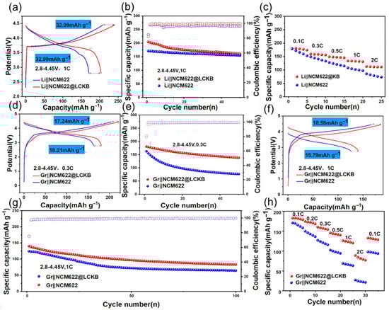 (a) Initial charge–discharge curves of the half-cells of Gr||NCM622 and Gr||NCM622@LCKB in the range from 2.8 to 4.45 V at 1 C. (b) Cycling performance of half-cells of Gr||NCM622 and Gr||NCM622@LCKB in the range from 2.8 to 4.45 V at 1 C. (c) Initial charge–discharge curves of the half-cells of Gr||NCM622 and Gr||NCM622@LCKB in the range from 2.8 to 4.45 V at 0.1 C, 0.2 C, 0.3 C, 0.5 C, 1 C, and 2 C. (d) Initial charge–discharge curves of the full cells of Gr||NCM622 and Gr||NCM622@LCKB in the range from 2.8 to 4.45 V at 0.3 C and (f) at 1 C. (e) Cycling performance of full cells of Gr||NCM622 and Gr||NCM622@LCKB in the range from 2.8 to 4.45 V at 0.3 C and (g) at 1 C. (h) Gr||NCM622 in the range from 2.8 to 4.45 V at 0.1 C, 0.2 C, 0.3 C, 0.5 C, 1 C, and 2 C.