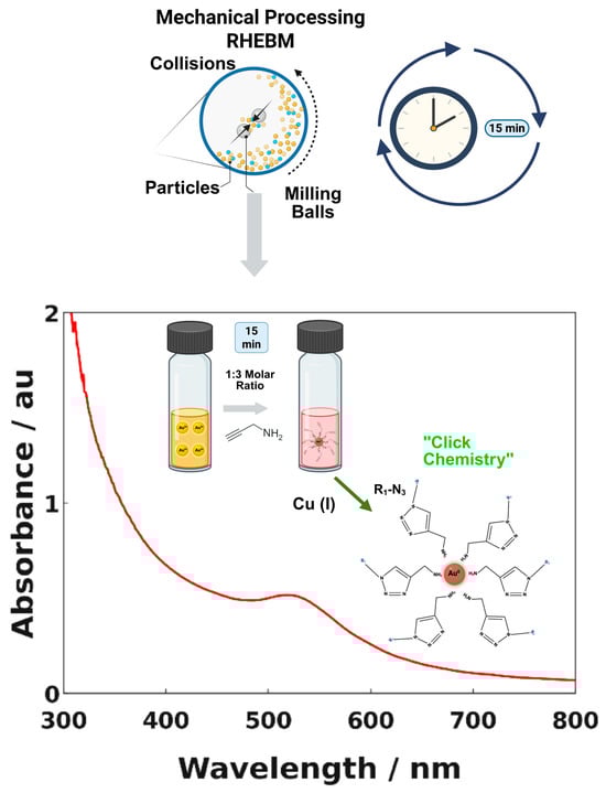 Bottom-up synthesis techniques, particularly those utilizing the mechanochemical reduction of gold salts in a sealed container using a ball milling device, have emerged as promising alternatives to conventional wet-chemical synthesis methods for metallic nanoparticles [7,8,9]. Traditional solution-based approaches—such as the Turkevich and Frens methods—generally require solvents, external reducing agents, and additional stabilizers, which can complicate the process and generate chemical waste [10]. In contrast, mechanochemical synthesis, especially when combined with primary amines as reducing agents, has been successfully applied to the reduction in various metals, including manganese, iron, gold, copper, vanadium, platinum, and bimetallic Pt/Ir systems [11,12,13,14]. This aqueous methodology offers several key advantages over traditional techniques, such as eliminating the need for solvents, reducing reaction times, and can lead to higher yields. The mechanical activation inherent in this process enables more efficient, sustainable chemical reactions, positioning mechanochemistry as a viable method for synthesizing a broad range of materials [7,9].