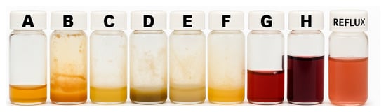 Control Samples. Vials (A–F) show no coloration. Vials (G,H) and the reflux sample exhibit a burgundy-colored solution, indicating the presence of plasmonic AuNPs.