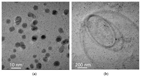 Transmission electron microscopy (TEM) images were obtained using a JEOL 2010 TEM (JEOL, Tokyo, Japan), with a 300 kV accelerating voltage and a 0.23 nm point resolution. Samples were prepared by dipping standard carbon-coated (200–300 Å), Formvar-covered copper grids (200-mesh) into a dilute solution of AuNPs in water or methanol. TEM grids were then allowed to dry under ambient conditions for 24 h. The size distributions of the AuNPs were determined from the diameters of at least 500 particles located in a representative region of the micrographs using ImageJ software 1.53k [25].