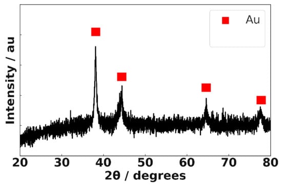 XRD pattern of Au@2-propynylamine NPs. The prominent diffraction peaks (red squares) correspond to the characteristic reflections of face-centered cubic (fcc) gold.
