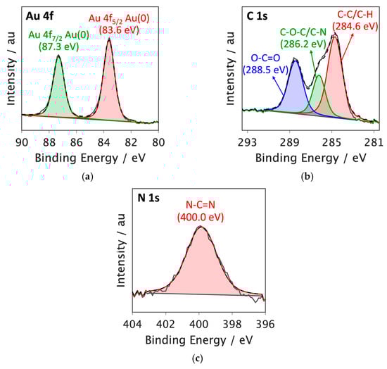 The N 1s XPS spectrum of Au@2-propynylamine NPs (Figure 5c) exhibits a peak at 400.0 eV, consistent with N–C=N bonds, confirming the interaction of the nitrogen-containing ligand with the nanoparticle surface [48,49].